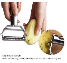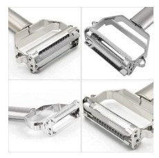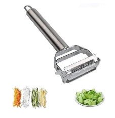 Sharp, ergonomic multi-functional peeler for effortlessly slicing, julienning, and peeling fruits and vegetables.